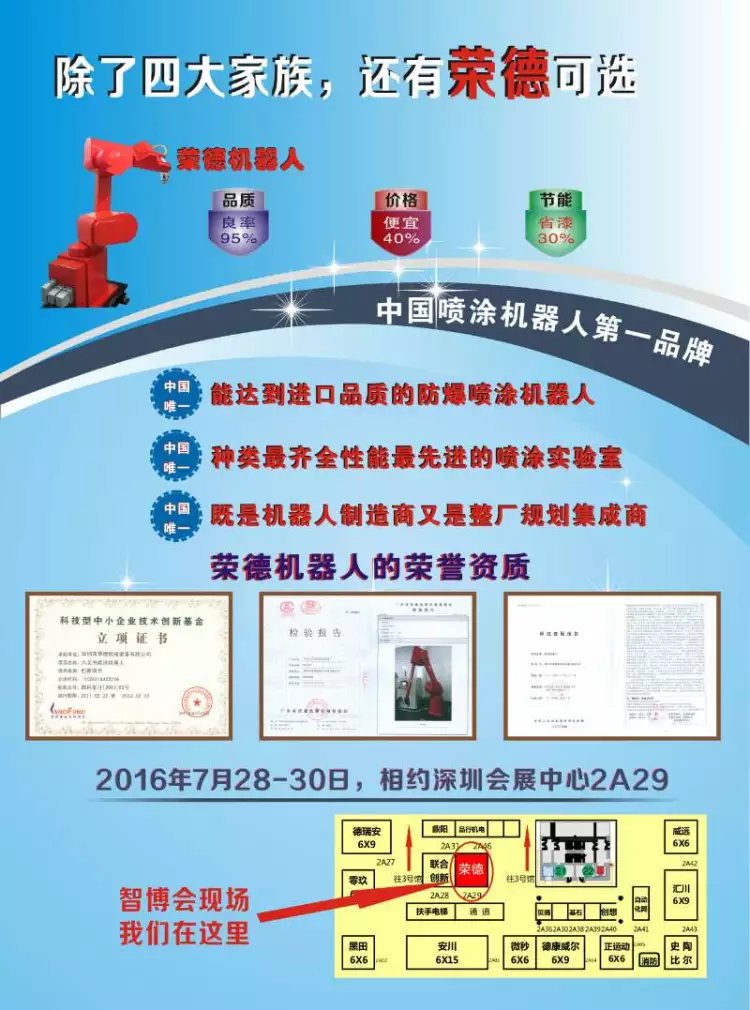 雖然在南海問題愈演愈烈的當(dāng)下,支持民族品牌已是大勢所趨,但榮德機(jī)器人不打感情牌,我們打技術(shù)牌、實(shí)力牌,如果您有興趣參觀過榮德的展位2A29,也許您會(huì)發(fā)現(xiàn):除了四大家族,榮德噴涂機(jī)器人也是一個(gè)非常不錯(cuò)的選擇!多謝指教!