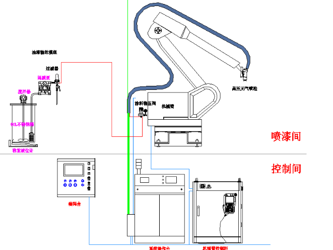 噴漆工位采用機(jī)械臂自動噴涂加人工補漆,其中人工補漆面積不能大于5%,應(yīng)保證線上能同時自動噴底漆和自動噴面漆,不允許采用更換油漆管道分不同時段噴底漆或面漆。自動噴涂工位主要配置由噴涂機(jī)器人(防爆型,且具有示教功能)、供漆系統(tǒng)(高壓無氣供漆泵及管路,油漆調(diào)漆桶,儲漆桶,氣動攪拌器等)、高壓無氣自動噴槍、人工補漆系統(tǒng)及控制系統(tǒng)等組成。