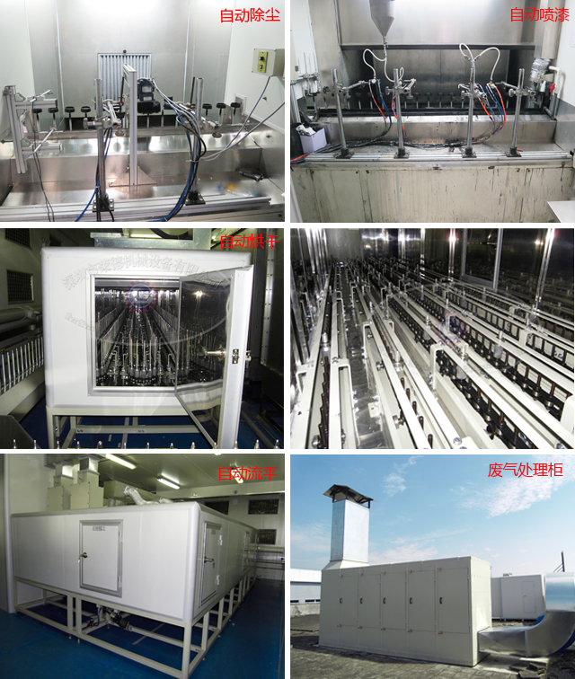 相機(jī)鏡頭固定噴槍式spindle噴涂流水線:噴漆裝工件治具—噴漆輸送線—噴漆前除塵—噴漆流平段—噴漆烘干線—噴漆廢氣處理柜