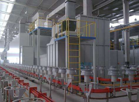 涂裝生產(chǎn)線主要工藝流程是上件→拋丸除銹→清理吹灰→噴鋁→底漆噴漆流平→底漆烘干→中涂噴漆流平→中涂烘干→面漆噴漆流平→面漆噴漆烘干→下件。涂裝線的防腐環(huán)境是室外(不直接淋雨),高架橋腹部波紋板。保護(hù)年限為長效型,50年。主要針對工廠構(gòu)件外表面涂漆,不考慮施工后涂裝。前處理拋丸,Sa3.0級、粗糙度/75-120um、清潔度/1級?;耐繉訛殡娀釃婁X,120-150μm;底涂層為環(huán)氧富鋅底漆,60-80μm,90℃60分鐘烘干。中間涂層為環(huán)氧云鐵中間漆,150-180μm;90℃90分鐘烘干。 面漆為丙烯酸聚氨酯或氟碳漆面漆,40-60μm。90℃60分鐘烘干??偲崮ず穸龋骸?50μm。