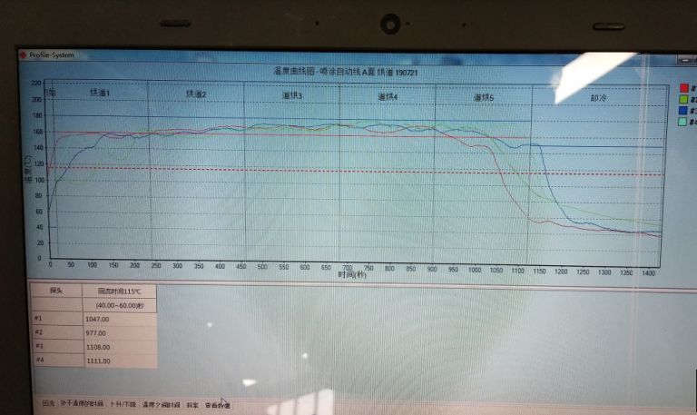 a噴涂生產(chǎn)線(xiàn)測(cè)溫 預(yù)熱設(shè)定120℃ ,烘烤5分鐘后溫度在90-120左右 ,沒(méi)有在±5的溫度范圍內(nèi),烘干線(xiàn)5節(jié)烤箱都設(shè)定170℃ ,只有 234節(jié)烤箱烤箱基本能在160-175這個(gè)溫度范圍內(nèi),沒(méi)有在總烘烤時(shí)間設(shè)定15分鐘, 需有12分鐘在165-175這個(gè)時(shí)間段內(nèi) b線(xiàn)測(cè)溫第一二節(jié)烤箱。
